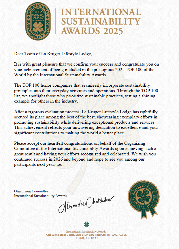 La Kruger Lifestyle Lodge is delighted to announce that we have been honoured with the prestigious title of "TOP 100 Sustainable Hotels & Resorts 2025 Winner!"